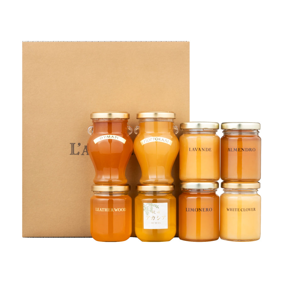 単価 あたり濃厚でジューシー濃密な味わいのはちみつの王様と呼ばれ、味・甘み・香り・余韻のすべてに感じる力強さがある「ギリシャ タイム」、濃厚でジューシーな「ギリシャ オレンジ」、ハーブらしいやさしい香りとまろやかな甘みの「フランス ラベンダー」、幻想的で華やかな香りの「タスマニア レザーウッド」、ナッツを思わせる香ばしい風味とまろやかな甘みの「スペイン アーモンド」、ほのかな酸味とクセのないやさしい甘みの「スペイン レモン」、青草を思わせる爽やかな香りとミルキーでやさしい甘みの「ニュージーランド ホワイトクローバー」、さらっとしていてとても扱いやすく、親しみやすい味わいの「秋田 アカシア(藤村氏)」のギフトセットです。