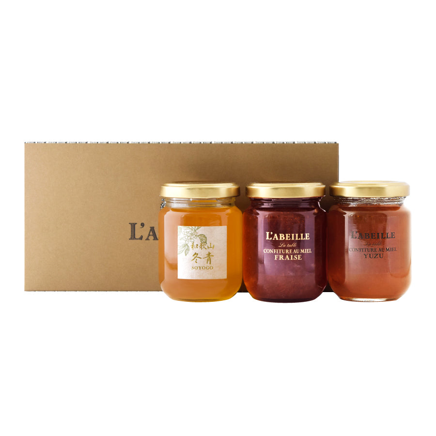 ほのかにキャラメルを思わせるコクと香りの「和歌山 冬青のはちみつ」、「はちみつコンフィチュールいちご」と「はちみつコンフィチュールゆず」の詰め合わせ。