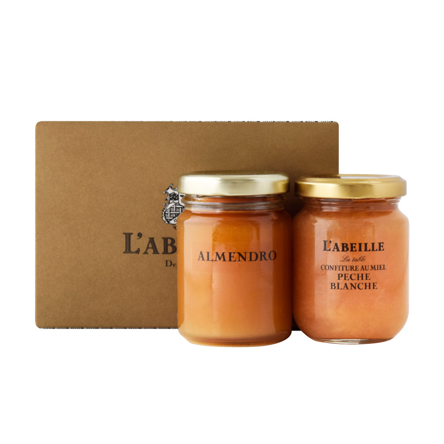 ナッツを思わせる香ばしい風味とまろやかな甘みが特徴の「スペイン産アーモンドはちみつ」、国産白桃をたっぷりのラベイユハニーで丁寧に煮詰めた「はちみつコンフィチュール 白桃」のギフトセット。