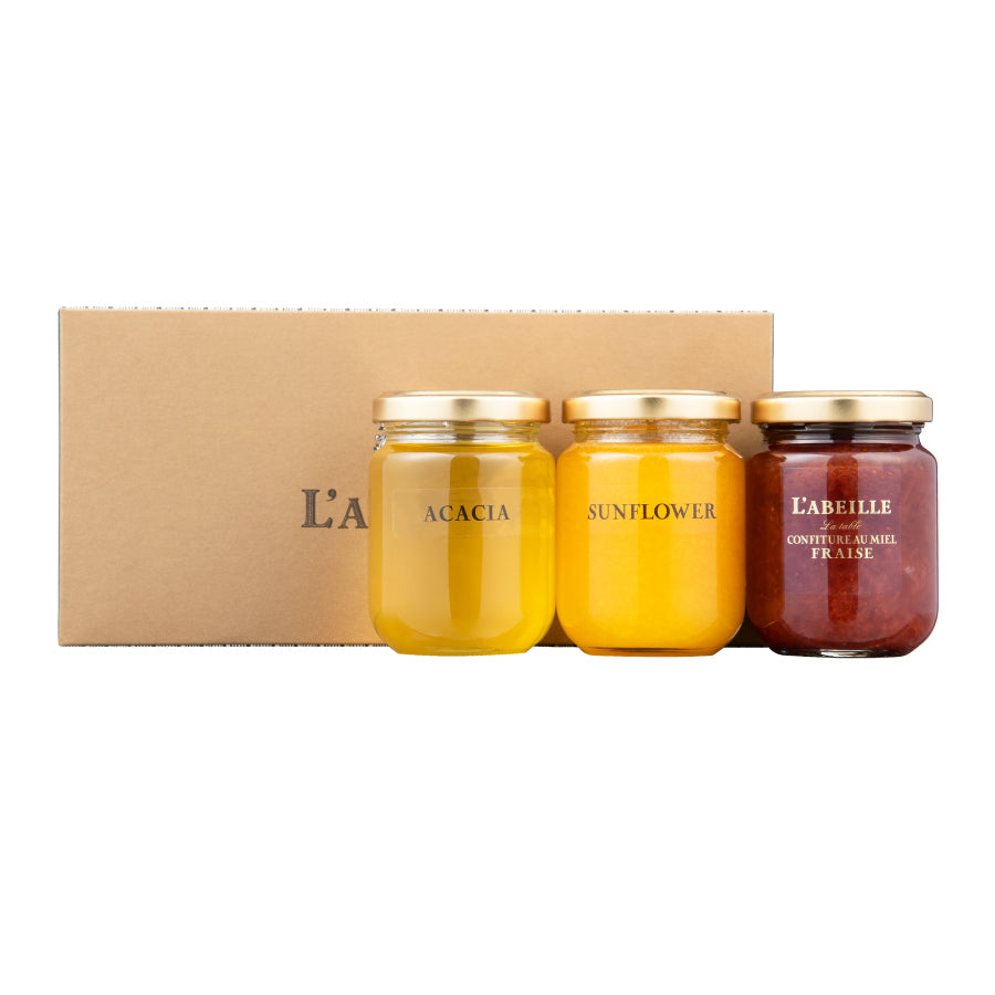 とろーっとなめらかな質感が魅力のクセのない「ブルガリア アカシア」、フルーティーな酸味とコクのある甘さの「ブルガリア ひまわり」、たっぷりのひまわりはちみつで国産いちごを煮込んだ「コンフィチュール いちご」のギフトセットです。