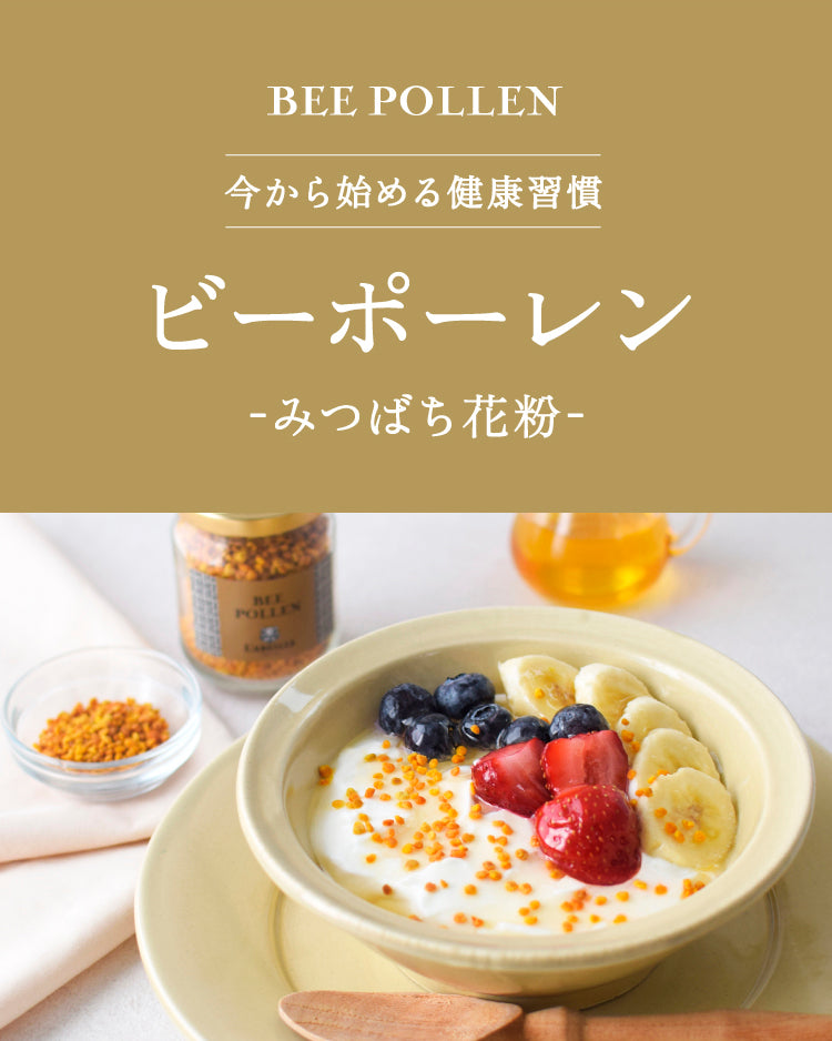 ビーポーレン(みつばち花粉)とは、自然の中で最も完璧に近い食品ともいわれています。みつばちは花粉を団子状に丸めて巣に持ち帰ります。この花粉には、ビタミン、ミネラル、酵素、アミノ酸など100種類以上の栄養素がバランス良く含まれており、必須アミノ酸も9種類全て含まれています。ヨーグルトやシリアル、サラダにかけて、毎日の健康や美容の補助としてお召し上がりください。