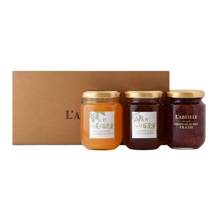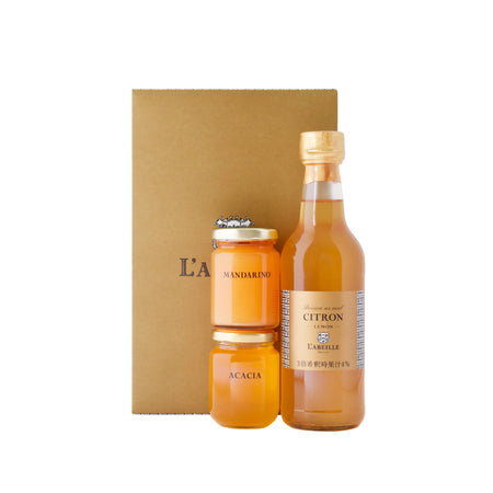 ギフトデュオ甘さと酸味のなかにオレンジの果実を思わせる爽やかな香りのスペイン産マンダリンオレンジはちみつと、たっぷりのはちみつで煮詰めたいちごコンフィチュールのギフトセット。3,672円 (税込) - はちみつで備える防災セット【セット内容】7,500円 (税込/送料込み)