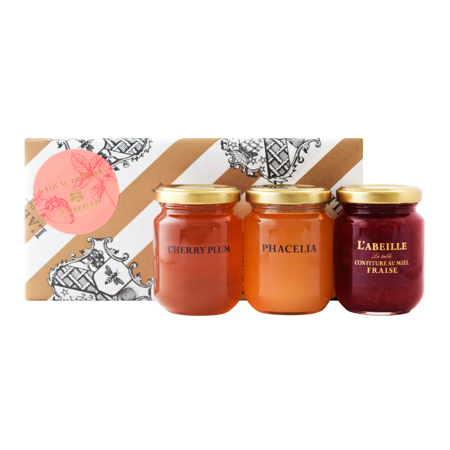芳醇な甘さとコクの中に甘酸っぱさを感じる「ブルガリア チェリープラム」はちみつ、やさしい甘みと穏やかな香りの「ハンガリー ファセリア」はちみつ、たっぷりのひまわりちみつと甘酸っぱいいちごを贅沢に煮込んだ「はちみつコンフィチュール いちご」のギフトセットです。